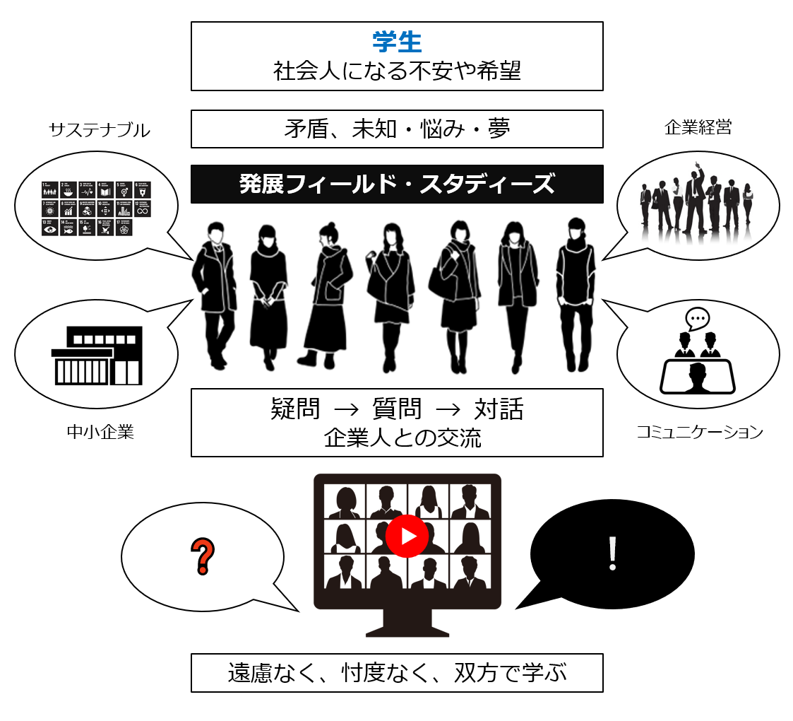 ニッセイエブロ社にご支援いただき、武蔵野大学発展フィールド・スタディーズが2022年7月より始まった。2022年度は学年、学科が異なる多様な15名の学生(留学生3名含む)が集まり「中小企業 × SDGs × 経営戦略」をテーマーにプロジェクトに取り組んだ。参加学生は、実際の企業の中に入り働き方、労働環境など、インタビュー調査をとおし理解し、学生視点での働き方改革などの提案をおこなった。