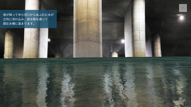 - 現実では見ることができない、洪水が流入してくる調圧水槽の様子を、疑似体験できます。