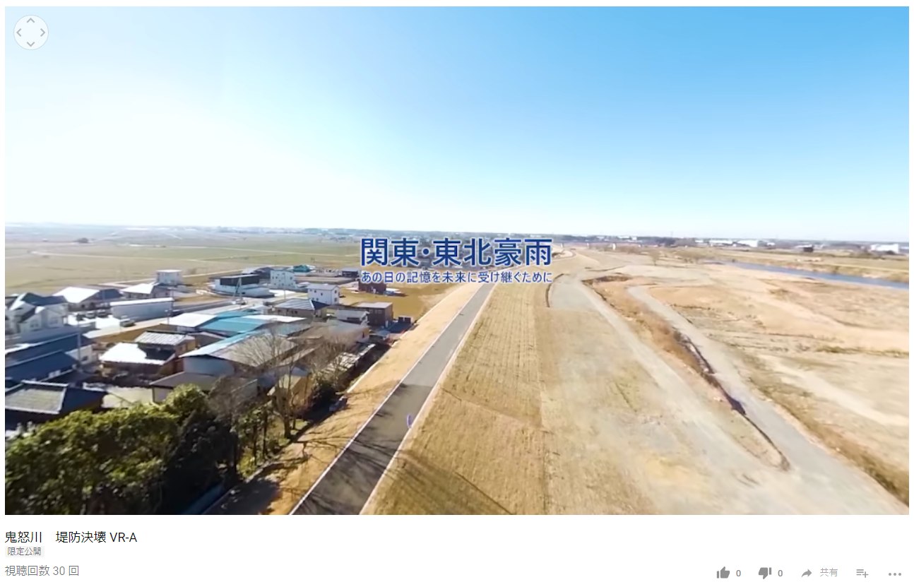 動画は決壊当時の記録データを活用して時間経過における「水深」などの情報を表現、決壊した堤防の上からと河川敷から堤防を見ている2つの視点で作成しています。